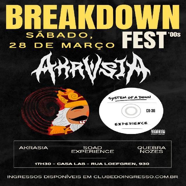 BREAKDOWN FEST ‘00s O Breakdown Fest junta os sons que gritavam quando a gente não sabia explicar o que sentia. Guitarras pesadas, versos sinceros, energia crua. Dos berros do nu metal à vulnerabilidade do emo dos anos 2000, tudo no mesmo lugar, do jeito que sempre gostamos. Porque algumas músicas não envelhecem. Elas crescem com a gente. Shows cover de: My Chemical Romance Green day Arctic monkeys Pitty Fall Out Boy Slipknot Linkin Park Bring me the Horizon Pierce the Veil System of a Down Atrações: Banda Quebra Nozes (@quebranozesbanda) Akrasia (@akrasiabanda) System of a Down Experience (@soad.experience.brasil)