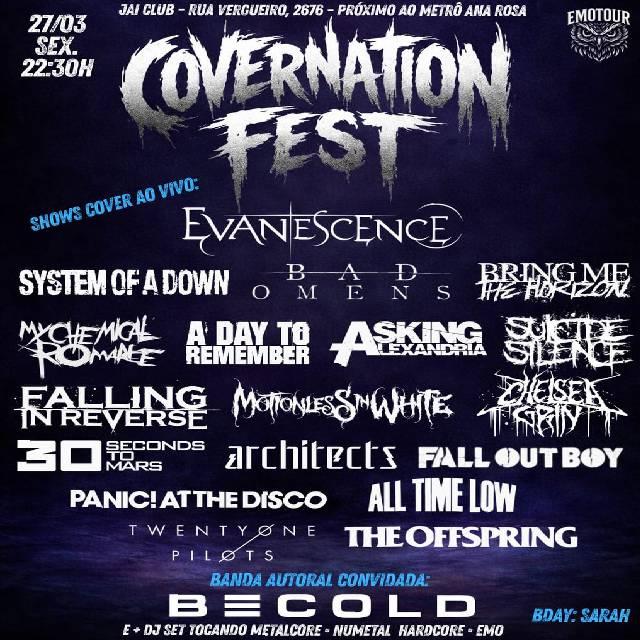 Covernation Fest na Jai Club O Covernation Fest chega pesado reunindo os maiores hinos do emo, metalcore e rock alternativo que marcaram gerações. Shows cover ao vivo tocando: Evanescence System Of a Down 30 Seconds To Mars Bring Me The Horizon My Chemical Romance A Day To Remember Bad Omens Motionless In White Asking Alexandria Falling In Reverse Suicide Silence Chelsea Grin Architects Twenty One Pilots Fall Out Boy Panic! At The Disco All Time Low The Offspring Bandas covers: @artifactevcover @ckhd_banda @banda_memories @oficialdanc Banda autoral convidada: BECOLD — uma das apostas do metalcore nacional +DJ set com muito metalcore, nu metal, hardcore e emo a noite inteira! Jai Club – Rua Vergueiro, 2676 (próx. Metrô Ana Rosa) 27/03 (sexta) 22h30 Evento pra maiores de 18 anos RESPEITO É A LEI! Chegou até 23h? Ganha um shot de tequila pra começar a noite do jeito certo.