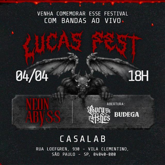 Lucas Fest na Casa Lab É com muita animação que apresentamos o LUCAS FEST, um festival de bandas pra comemorar meus 30 anos. Você é nosso convidado pra essa barulheira Infos todas na arte. Venham curtir esse som e celebrar minhas três décadas, hehe
