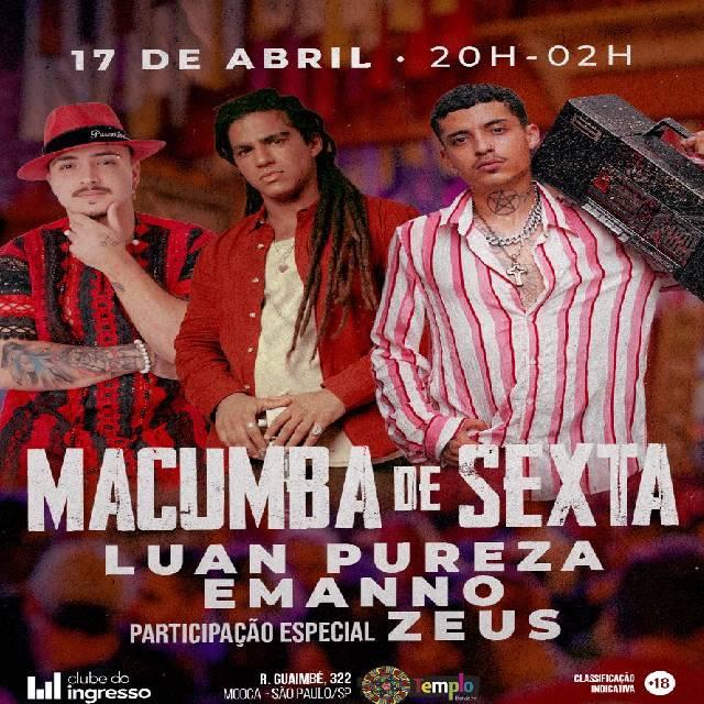 Prepare-se para uma noite intensa, vibrante e cheia de identidade! O Macumba de Sexta chega com tudo no dia 17 de abril, das 20h às 02h, trazendo uma mistura envolvente de ritmos, atitude e energia contagiante. No comando da noite, Luan Pureza e Emanno prometem um show marcante, com um repertório que transita entre o moderno e o autêntico, criando uma atmosfera única para quem curte música com personalidade. E para deixar tudo ainda mais especial, a noite conta com a participação especial de Zeus, elevando ainda mais a experiência. O evento acontece no Templo Bar de Fé, localizado na Rua Guaimbé, 322 – Mooca, São Paulo/SP, um espaço conhecido por sua vibe diferenciada e conexão com o público. Garanta seu ingresso e venha viver essa experiência única, onde música, cultura e energia se encontram para uma sexta-feira inesquecível!